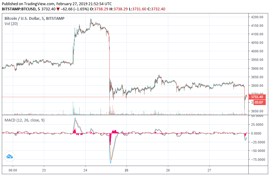 bitcoin had bounced around the $3,800 mark for most of the day but dipped below it shortly before 14:00 UTC. Six hours later, the flagship cryptocurrency experienced a sharp drop that carried it from $3,795 to $3,658 within a matter of minutes.