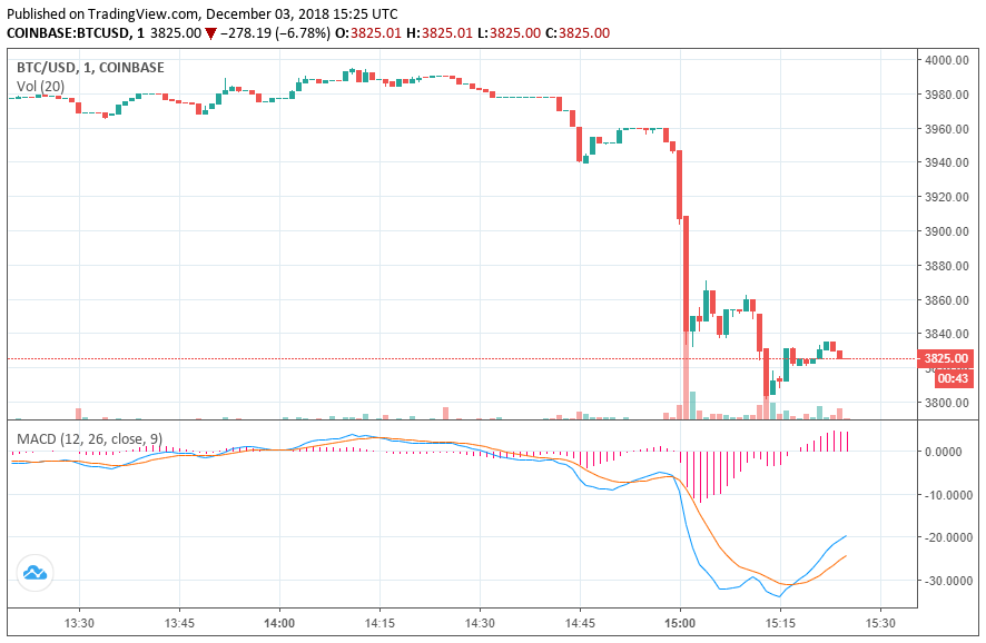 Unfortunately, that bounce did not occur, and this afternoon the bitcoin price fell below $4,000, which triggered further selling all the way down to $3,801 on Coinbase — its lowest point since Nov. 28. As of the time of writing, BTC/USD was holding at $3,825.