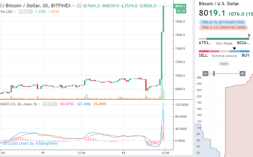 Thursday’s trading witnessed bitcoin price spiking upwards from under $6,900 to $8,000, a new high for April.