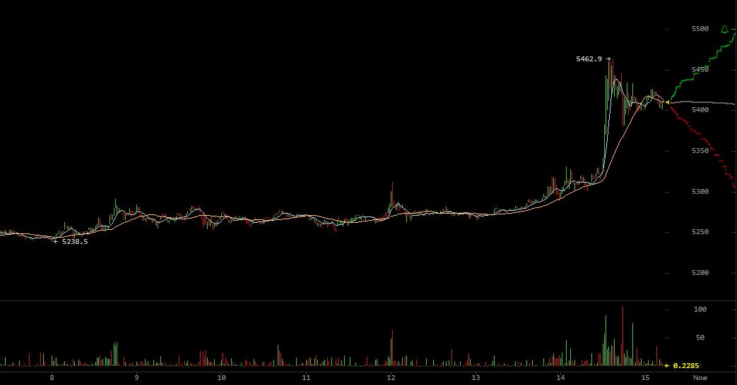 The flagship cryptocurrency held above $5,200 throughout the morning, but it began to climb heading into the afternoon. At 18:30 UTC, a surge in buy orders propelled the as high as $5,462 on Bitstamp. At last check, it traded at $5,408 for a 24-hour gain of 3.37 percent.