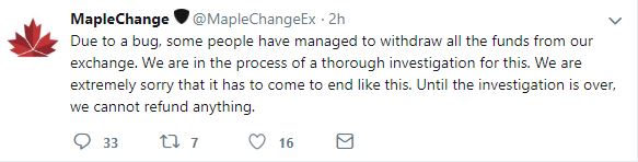 A small bitcoin exchange based in Alberta, Canada, has gone offline. Before their Twitter page went offline, MapleChange had that they “[had] no more funds to pay anyone back.”