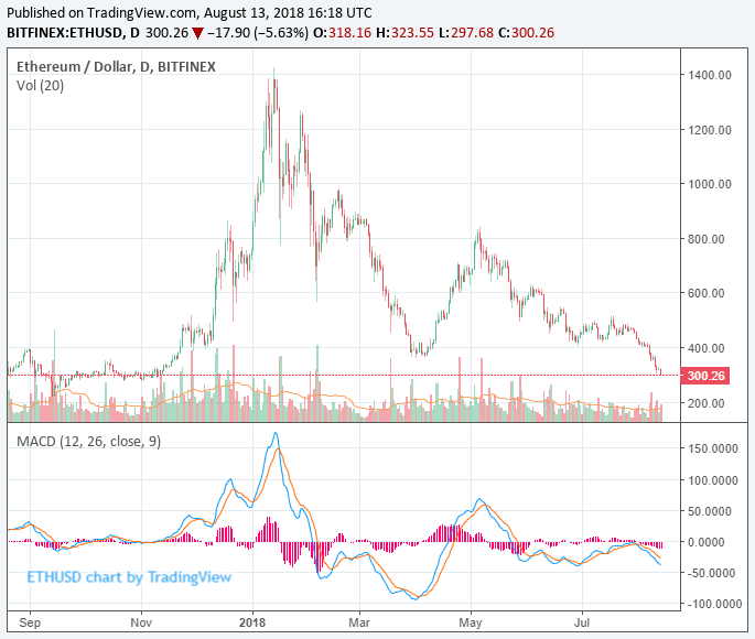 At 15:43, ETH closed just pennies above $300, and less than one minute later it fell below that mark on Bitfinex for the first time since Nov. 12. As of 16:45 UTC, the ethereum price had dropped to $293. Ethereum is now down seven percent for the day and more than 61 percent in 2018.