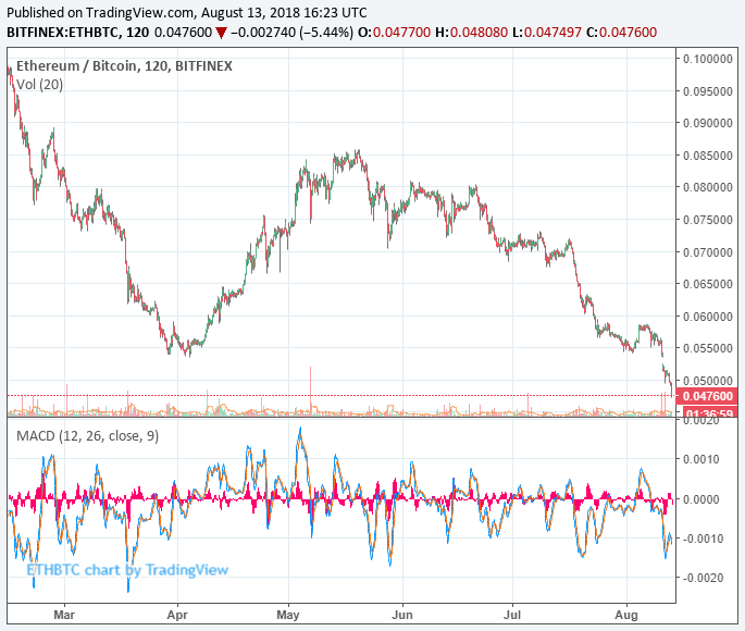 At a present value of 0.047, ETH/BTC is now trading at levels not seen since mid-December, when the bitcoin price went parabolic and briefly peaked at $19,891 on Bitfinex.