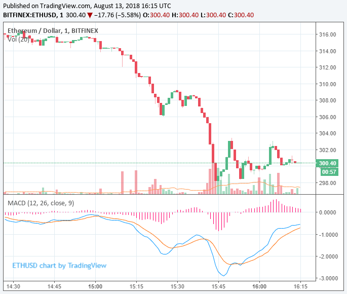 Ethereum had traded as high as $323 earlier in the day, but a flurry of sell orders began to pummel the market at approximately 15:00 UTC, driving ETH closer and closer to $300, a level it had not touched since 2017.