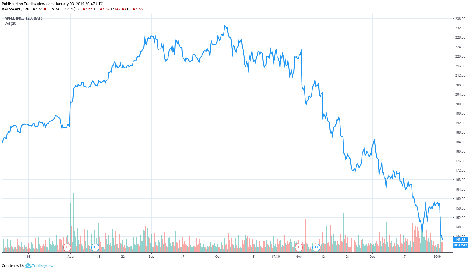 Assuming the Norwegian government-controlled fund hasn’t sold any Apple shares recently – its nearly $10 billion investment is now worth just over $6 billion. $500 million of that was wiped out last night alone. This after the fall in Apple share price from $225 per share at the end September 2018, to its now $142 per share.