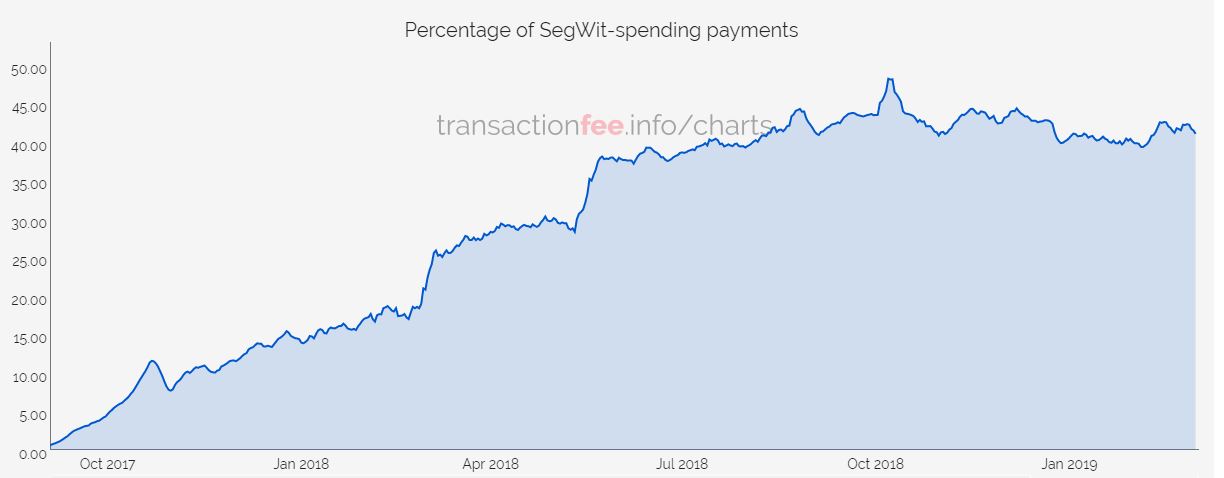 Segregated Witness (SegWit) payments have been steadily rising since late 2017. | Source: Transactionfee.info