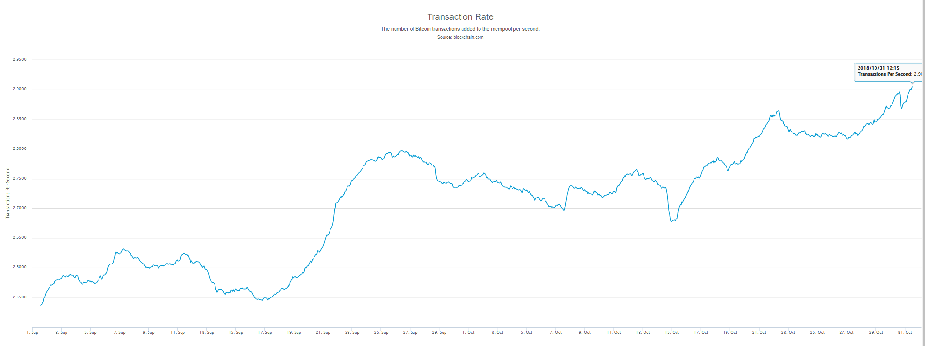 At the time of writing, the bitcoin network has been steadily increasing the number of transactions. On the last day of October, almost 3 transactions per second were being processed.