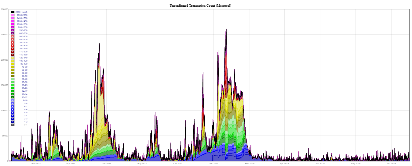 Looking now into the mempool, we can clearly see the number of transactions waiting to be confirmed have been steadily declining throughout 2018. Of course there is an obvious correlation between the number of unconfirmed transactions and the price of bitcoin, as when we see sudden spikes in demand like the ones in late 2016 and 2017, price exponentially rises, transactions get expensive to process and there is a sudden lag in the number of approved transactions, as miners cannot cope with the amount of network requests.