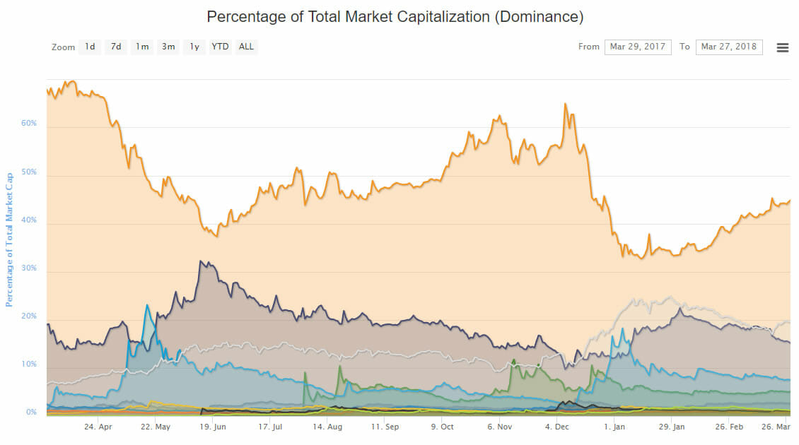 Altcoin hodlers are getting hammered at the moment as bitcoin’s market dominance heads back towards 50%. Since March last year BTC has lost ground to altcoins which have been steadily eating away at its market share. The low point was around the January spike when BTC dropped to 32% however it has been clawing back its market dominance ever since, largely at the expense of which has shed almost 50% in a month. Currently bitcoin has just under 45% market dominance and it does not look like this is about to change.