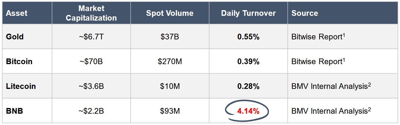 If Binance Coin’s reported volume was genuine, it would represent a higher daily turnover than any other major traded asset. (Volume taken from as denoted by Bitwise).