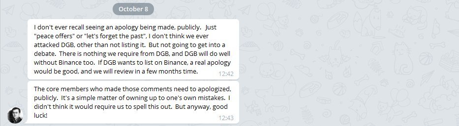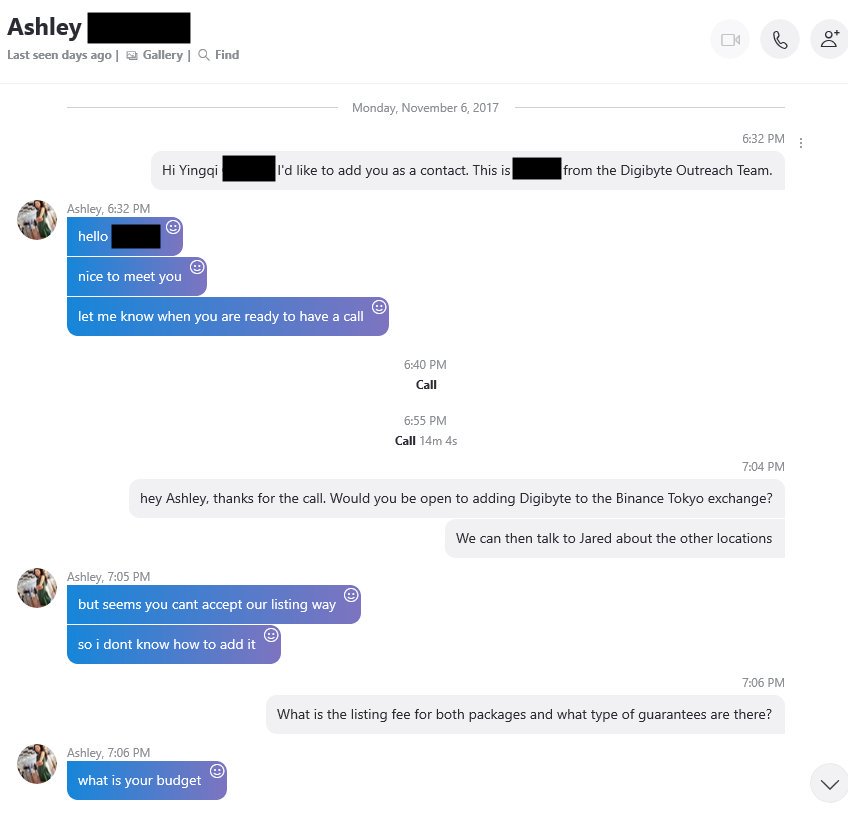 This from October 2018 shows, with screenshots, how a Binance representative allegedly demanded ‘pay-for-play’ from the DigiByte (DGB) team. When the DigiByte team member asked how much the listing fee was, the reply was: ‘What is your budget?’