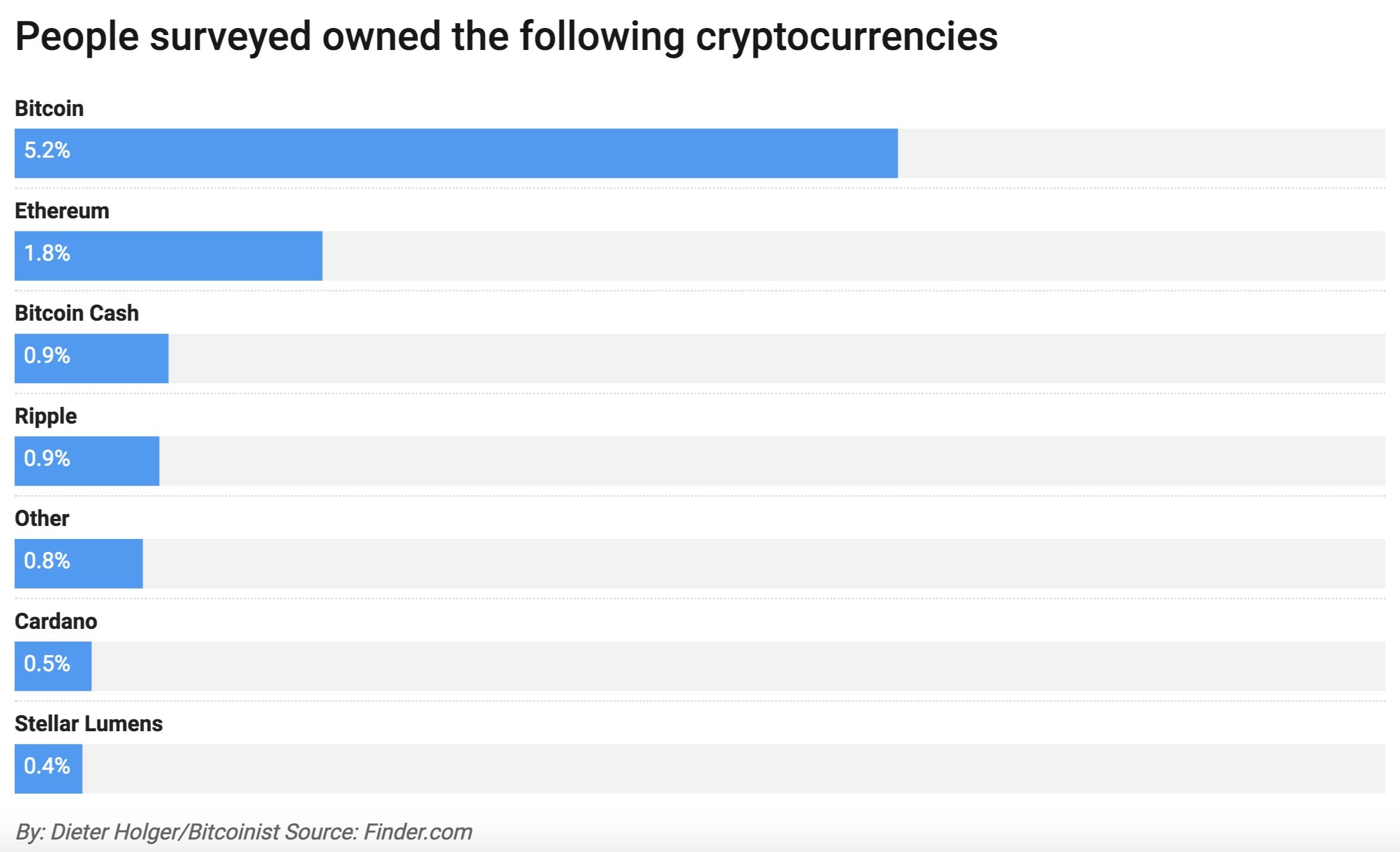 Nearly 16.3 million Americans, or 8 percent of the country, own some form of cryptocurrency, according to a new survey by Finder.com, which also found slightly more than 5 percent of Americans owned bitcoin. If accurate, the results mark an increase from a study the published in December 2016 that revealed roughly half of Americans had heard of bitcoin but only 1 percent had traded, collected or used it.
