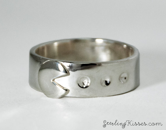 This ring is made by hand. The polished band is detailed with three small indents and has been cast in 925 sterling silver. The ring is 7mm wide and fits a US size 11.5 Can be sized free of charge. Pac-Gal is sold separately and can be found here on my Etsy shop!