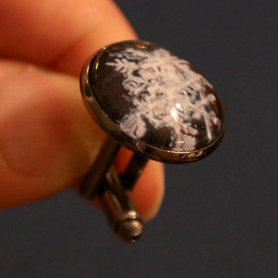 Photo of a snowflake covered in glass. Another way to preserve a snowflake forever is in a photograph. The picture was taken by me and is magnified by a dome of glass making striking cuff links to show off.