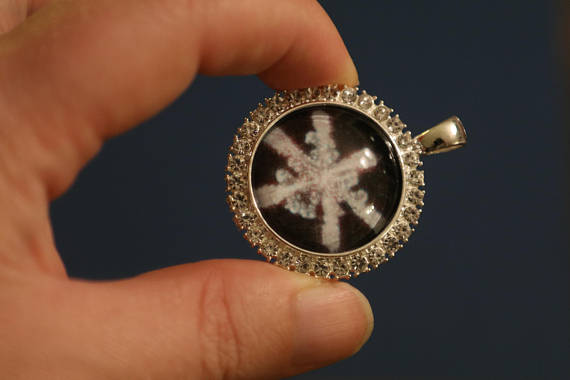 Photo of a snowflake covered in glass. Another way to preserve a snowflake forever is in a photograph. The picture was taken by me and is magnified by a dome of glass making a striking key chain to show off.