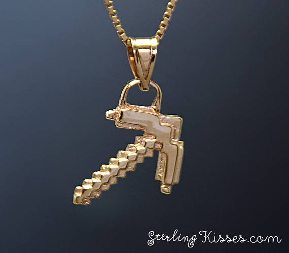 It is crafted in solid 14kt Yellow Gold and is double sided. This pixel perfect pickaxe reflects light beautifully off its high polished surface.