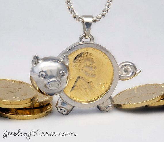 It can't hold as much as a real piggy bank, but this little piggy will carry a special penny just for you as it dangles on your neck, from market all the way home.