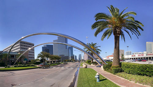 This is Post Oak road in Houston, Texas, just south of the Galleria. The chrome arches mark a crosswalk. There are several similar decorations in this part of town.
