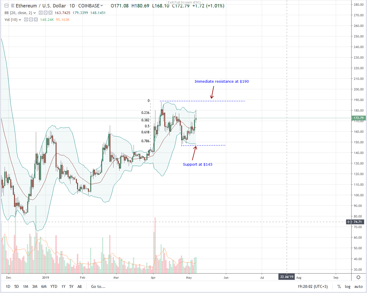 The trend is up, and as such, our anchor bar is Apr-25. Although it is bearish and bulls are in control, accompanying volumes are low. In that case, a comprehensive close above $190 must be with higher volumes above 160k in a breakout signaling trend continuation.