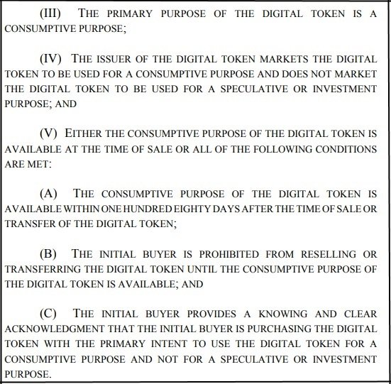 Under the Digital Token Act, cryptocurrencies are exempt from state securities laws if the “primary purpose of the digital token is a consumptive purpose.”