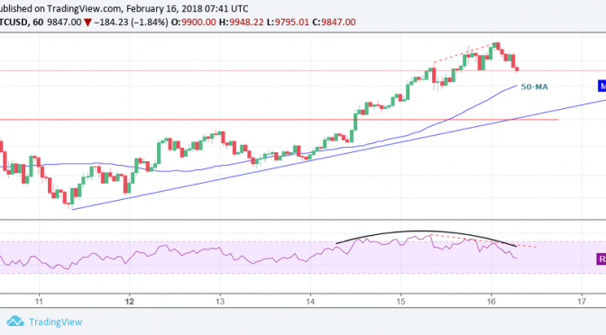 - Rounding top on the RSI, indicating the rally from the Feb. 11 low of $7,857.78 may have found a temporary top above $10,000.