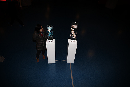 transmediale 2014 afterglow opened its doors on January 29, 2014, at Haus der Kulturen der Welt. The official Opening Ceremony was celebrated in the company of special guests and speakers, among them cypherpunk writer and critic Bruce Sterling. During the evening, the works produced by the hackers-artists of Art Hack Day Berlin : Afterglow opened to the public in a special exhibition opening. Accompanying the Opening Ceremony and exhibition opening were the interactive big-data producing installation by CRITICAL INFRASTRUCTURE (Jamie Allen & David Gauthier), installation and performance by MSHR as well as screenings of works by Borja Rodríguez Alonso, Pavel Ziemilski and Luther Price. Furthermore, Geraldine Juárez performed "Hello bitcoin," an action of literal cryptocurrency burning.