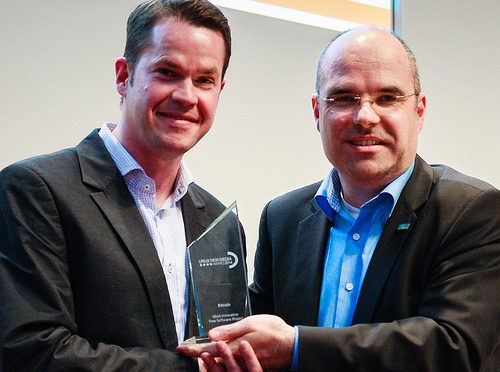 Winner of the category "Most Innovative Free Software Project": bitcoin. Thomas Uhl, Vice Chairman of the Open Source Business Alliance (OSB Alliance) presenting the Award to Oliver Flaskämper of bitcoin Deutschland GmbH.