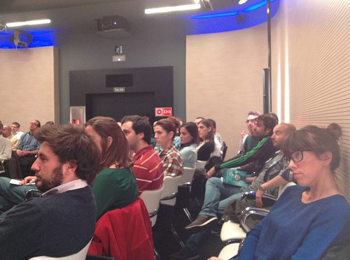 Asistentes a TEDxGranViaSalon sobre "¿Nueva? Economía" atendiendo a los vídeos proyectados