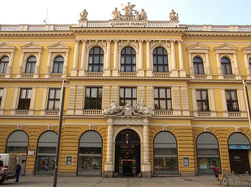 The Promenade — a few meters south of the Hauptplatz (Main Square) and Landstraße, an avenue lined with shops, department stores and malls. Here, a mighty impressive savings bank got established in 1849. The high-ceilinged lobby of this historic structure will be the setting of a panel discussion about Bitcoins and Co. and payment systems of the future. Credit: Martin Hieslmair