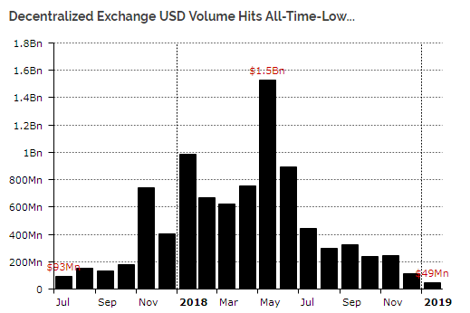 According to a by blockchain intelligence firm Diar, published January 28, 2019, the US dollar trading volume in decentralized exchanges (DEXs) has hit an all-time low. This comes at a time when the nascent industry’s thought leaders are pushing for a major transition from centralized exchange platforms to decentralized ones.