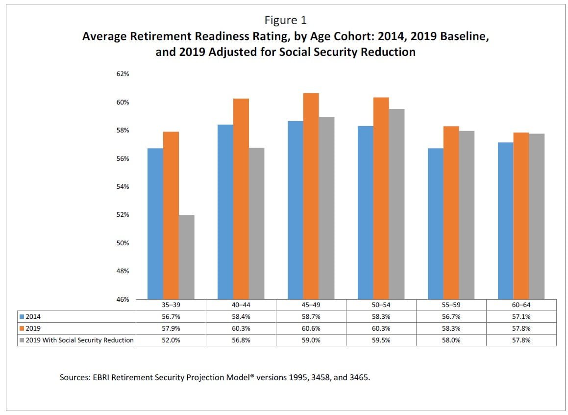 The EBRI Retirement Readiness RatingTM (RRR) simulates the percentage of future retirement paths where a household is projected NOT to run short of money in retirement. In other words, this can be thought of as a probability of a successful retirement. Overall, the average RRR for 20144 was 57.7 percent. This value increased by 1.7 percentage points to 59.4 percent in 2019. In other words, the new version of the EBRI simulation model estimates that 4.0 percent fewer households will run short of money in retirement than was the case with the 2014 version of the model.5