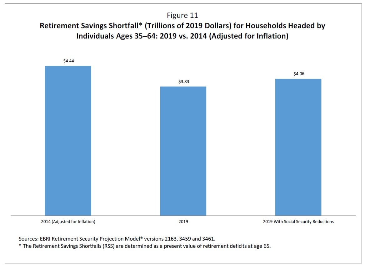 - The model finds that the aggregate retirement deficit American households in this age cohort face, taking into account current Social Security retirement benefits, is currently estimated to be $3.83 trillion. The similar figure (adjusted for inflation) from 2014 was $4.44 trillion.