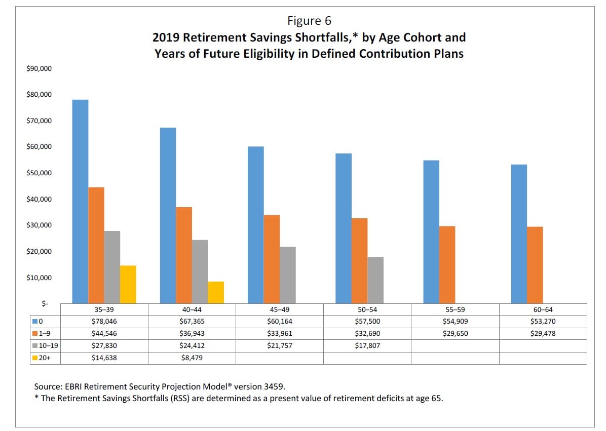 - Defined contribution plan eligibility has a significant impact: The average retirement deficit for individuals ages 35–39 with no future years of eligibility in a defined contribution plan is $78,046 per individual. This is more than five times the average retirement deficit for those fortunate enough to have at least 20 years of future eligibility in a defined contribution plan (where the average retirement deficit is $14,638).