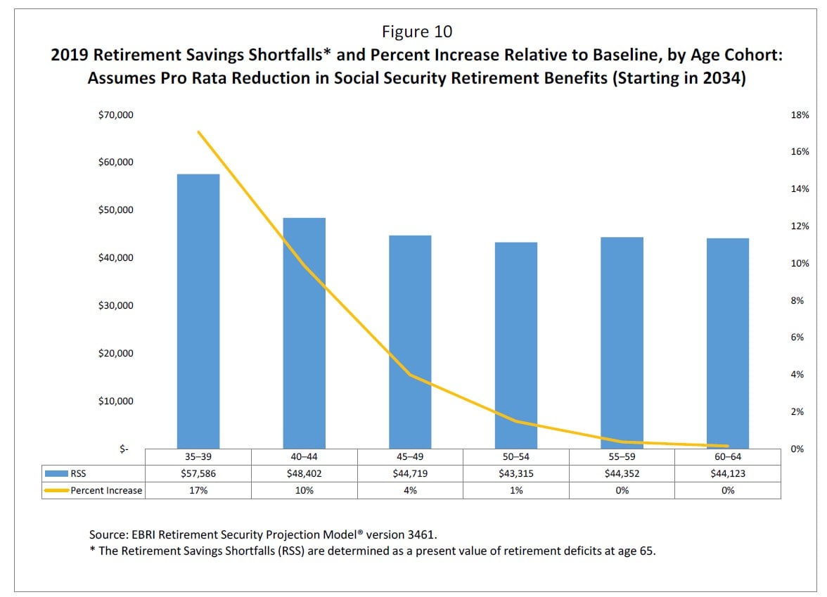 - A 23 percent pro rata reduction to Social Security retirement benefits beginning in 2034 would increase average retirement deficits by an average of 17 percent for those currently ages 35–39.