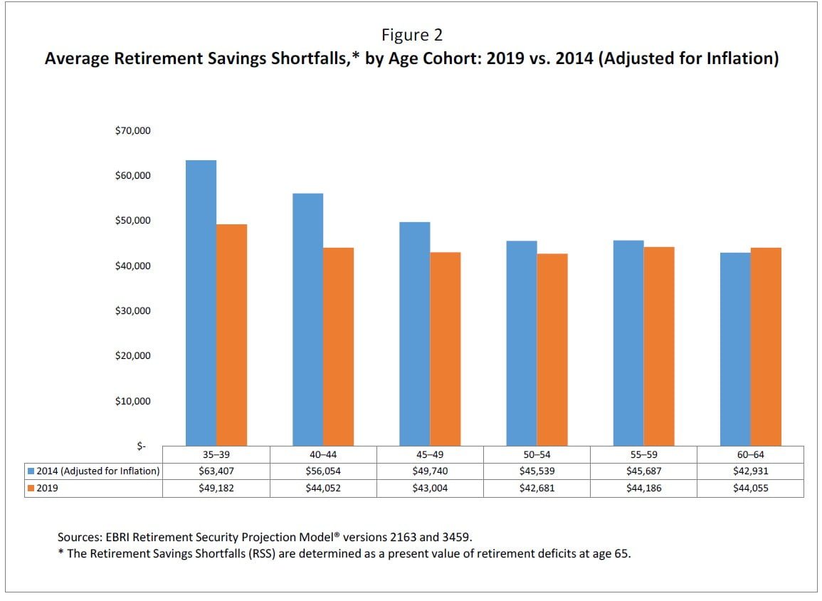 - For 2019, RSPM® finds that 40.6 percent of all U.S. households where the head of the is between 35 and 64, inclusive, are projected to run short of money in retirement. That is down by 1.7 percentage points vs. 2014.