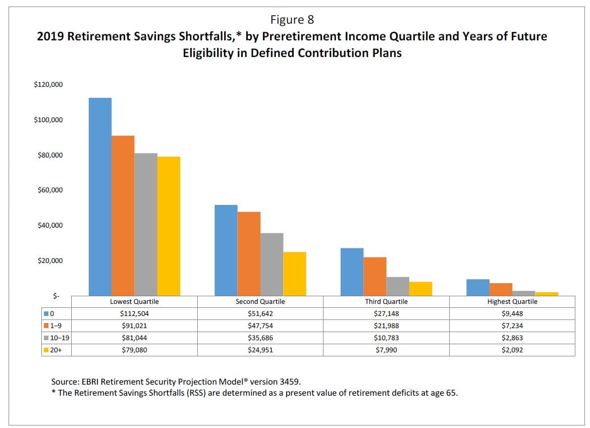 Figure 8 shows the impact of eligibility for participation in a defined contribution plan after controlling for the influence of preretirement income on Retirement Savings Shortfalls. Within even the lowest preretirement income quartile, the average deficit decreases by 30 percent (from $112,504 to $79,080) when those with no years of future eligibility in a defined contribution plan are compared with those with 20 or more years. The reduction is even more significant for those in the higher income categories: