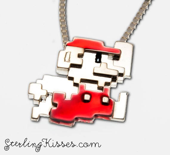 This charming retro-style pendant features an 8-bit Mario in his iconic jumping pose. It comes in sterling silver or with red enamel. A green version is also available for you Luigi fans!