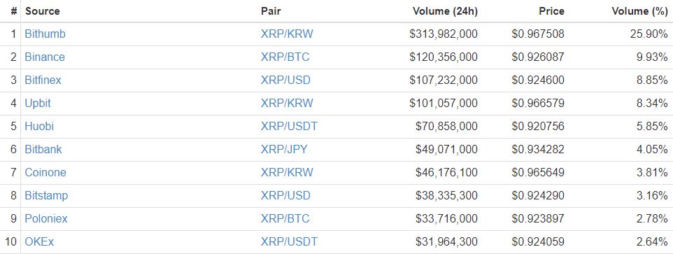XRP trading volume is still heavily concentrated on South Korean exchanges, although somewhat less than it was on Monday. Bithumb’s XRP/KRW trading pair accounts for nearly 26 percent of all Ripple volume, while fellow XRP/KRW markets Upbit and Coinone comprise another 12 percent. These Korean exchanges are now pricing Ripple at a four percent premium over its value in other markets.