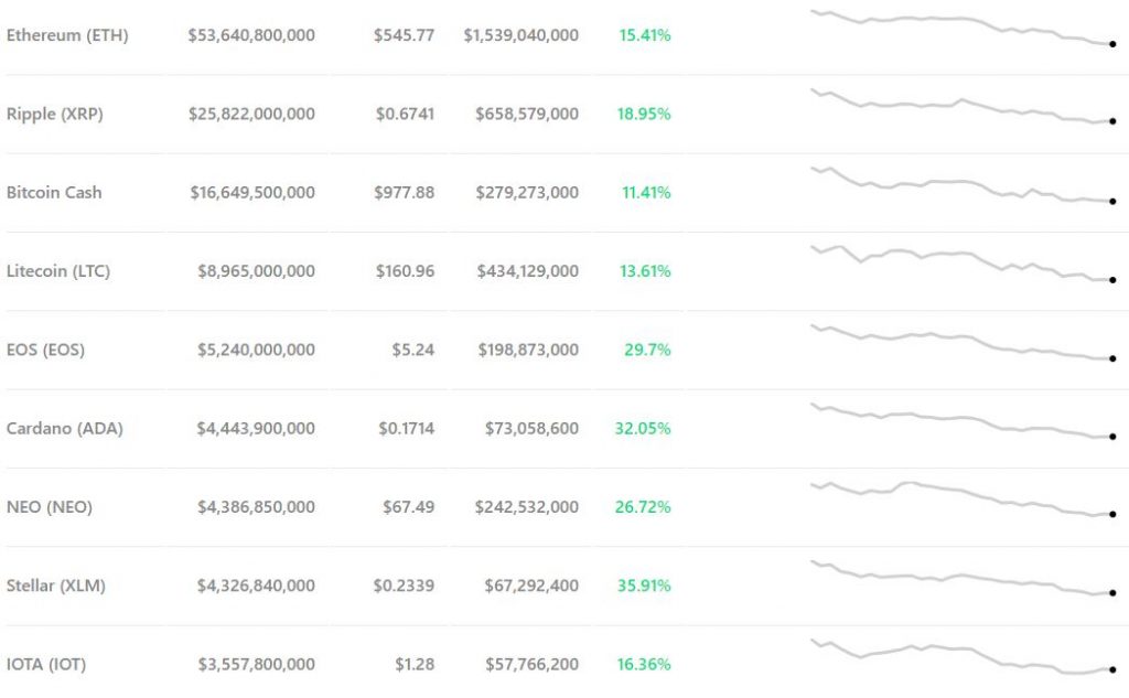 Sixth-ranked EOS soared by nearly 30 percent, raising its price to $5.24, and the Cardano price climbed to $0.17 following its 32 percent surge. NEO’s climb was not quite so precipitous, but its price still climbed by nearly 27 percent to $67.49.