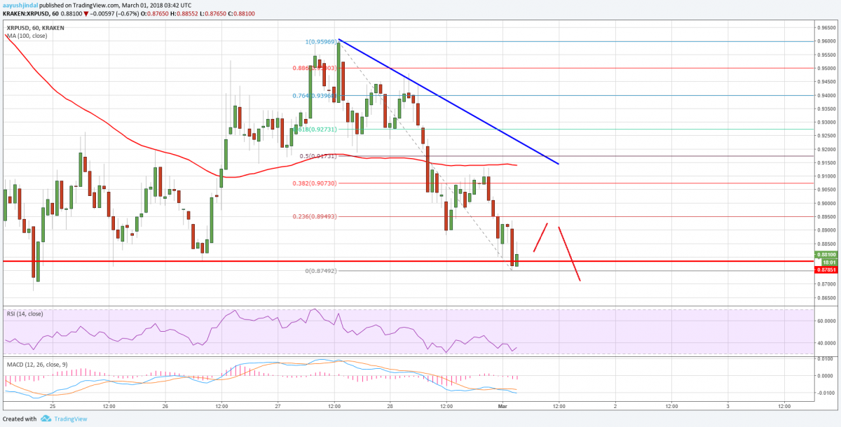 Ripple price is struggling to gain upside momentum against the US Dollar and bitcoin. XRP/USD is testing the $0.8800 support and it decline further in the near term.
