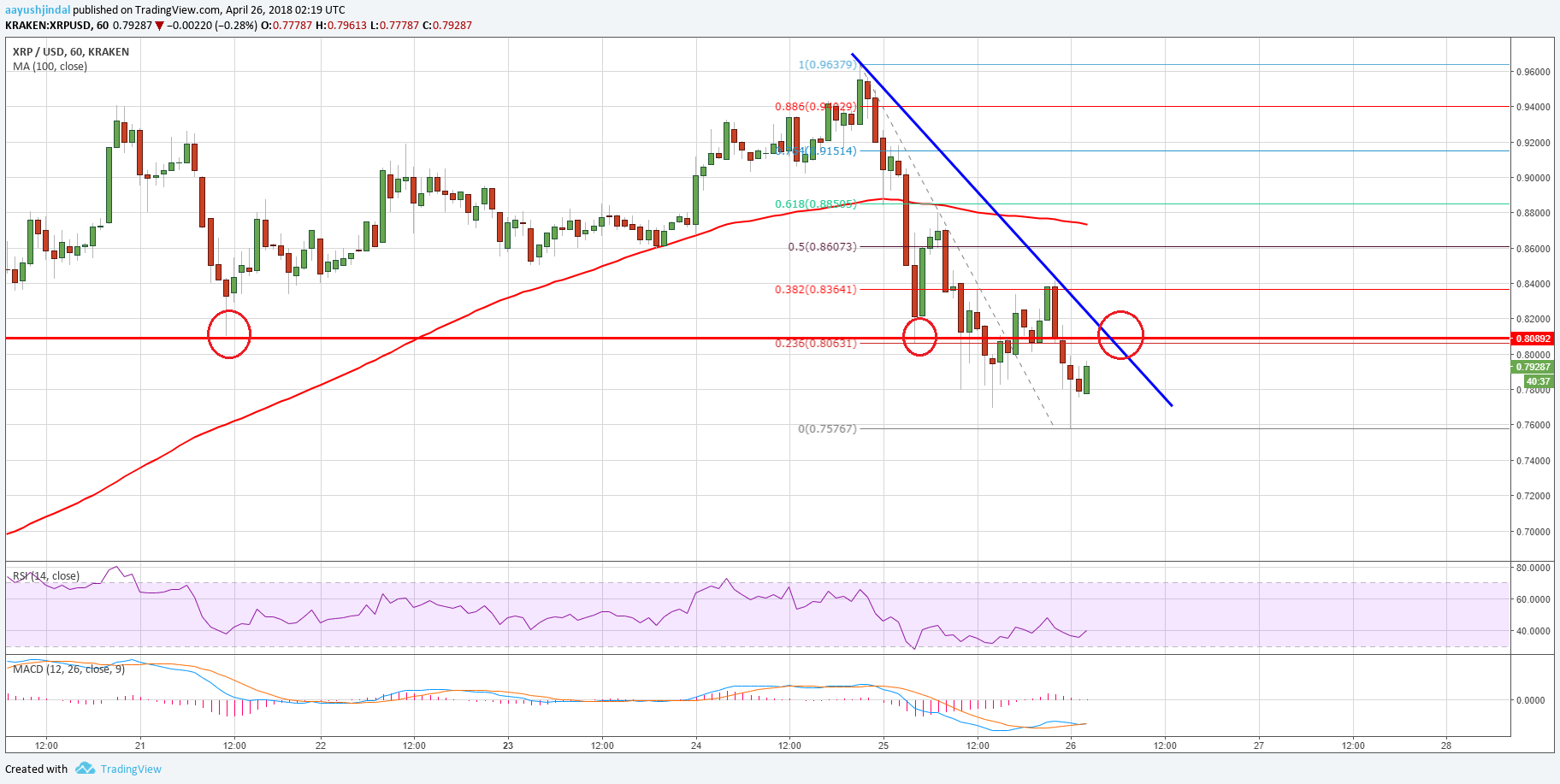 It is now trading well below $0.8400 and the 100 hourly simple moving average. It traded as low as $0.7576 recently and is currently consolidating losses. An initial resistance is near the 23.6% Fib retracement level of the last decline from the $0.9637 high to $0.7576 low. Moreover, there is a short-term connecting bearish trend line forming with resistance at $0.8080 on the hourly chart of the XRP/USD pair. A break above the trend line resistance at $0.8080 could open the doors for more gains. However, a proper break above $0.8150 is needed for a convincing move into a .