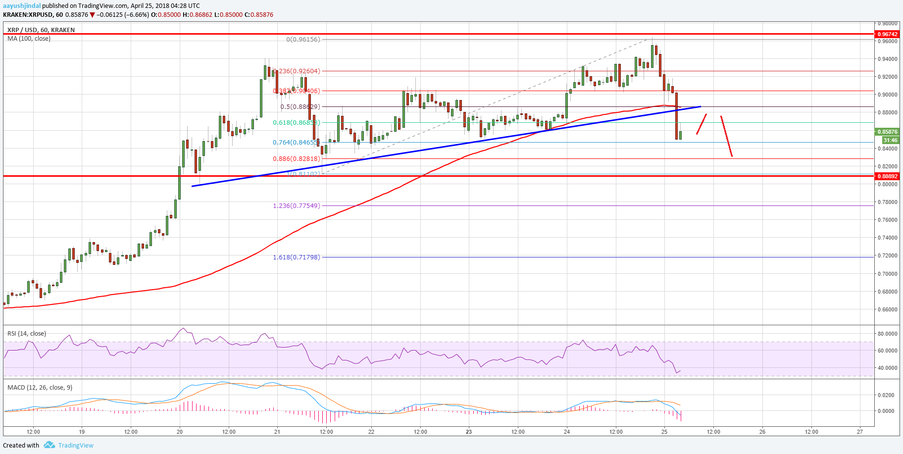 More importantly, there was a break below a connecting bullish trend line with support at $0.8850 on the hourly chart of the XRP/USD pair. The pair even broke the 61.8% Fib retracement level of the last wave from the $0.8110 low to $0.9615 high. Therefore, there are high chances of it extending declines towards the last swing low of $0.8110. However, the most important support is close to $0.8050 and $0.8000. Buyers are likely to take a stand near the if the price continues to correct lower in the short term.