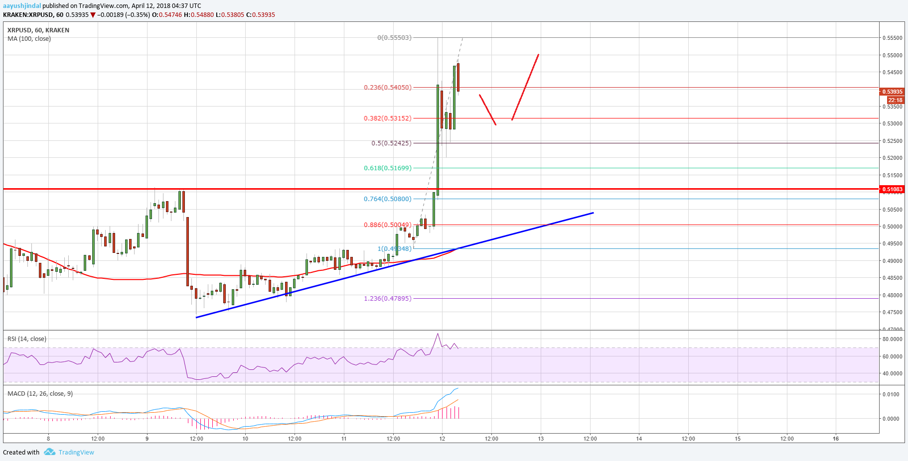 There was a formed near the $0.4850 level in Ripple price against the US Dollar. The price started an upside move and succeeded in breaking the $0.5000 resistance. It opened the doors for more gains, which resulted in an hourly close above $0.5100 and the 100 hourly simple moving average. It even moved past the $0.5200 resistance and traded as high as $0.5550 recently.