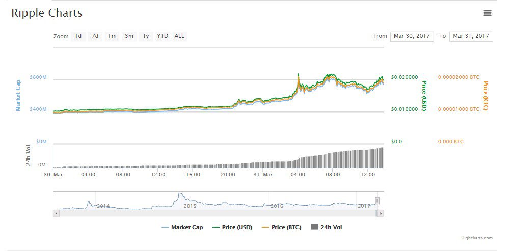 Dash started making notable gains yesterday, rising from $0.0098 to $0.01. On the last day of March, Ripple’s XRP token soared from $0.01 to $0.0205, nearly doubling in a 13-hour period. The cryptocurrency is now trading at levels last seen in January 2015.