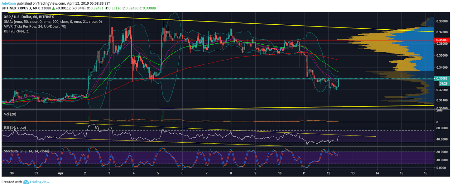 (XRP) is all set to break past the 50-day1 exponential moving average as the price has now found a strong support around the $0.3236 mark. This is a very strong support that would be very hard to breach during the next downtrend which is why now has better prospects of breaking the symmetrical triangle it is trading into the upside. The VPVR indicator on the 1D chart for XRP/USD shows that the price will run into a strong resistance soon as it breaks out of the triangle. However, Ripple (XRP) is still quite oversold on both the daily and weekly time frames compared to most other cryptocurrencies. This is why it might have more room to rally short term as the price has already been oversold for far too long.