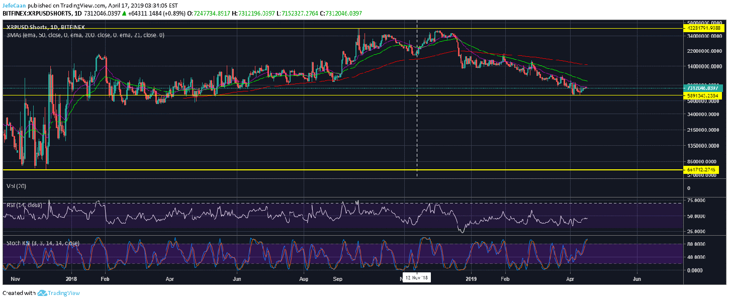 For long term believers in (XRP), there is still a lot of hope. Even though the hype might have died down for now but that could be a blessing in disguise for savvy investors looking to accumulate long term. The daily chart for shows that the number of margined shorts for XRP/USD has a lot of room for decline. The Stochastic RSI shows that this decline could lead to (XRP) seeing massive spike in its price as the sell pressure subsides. However, it is important to realize that as the market prepares for the next decline, (XRP) is unlikely to be a lone survivor and will most likely face the same outcome which is why we could see XRPUSDShorts rise before the ultimate decline.