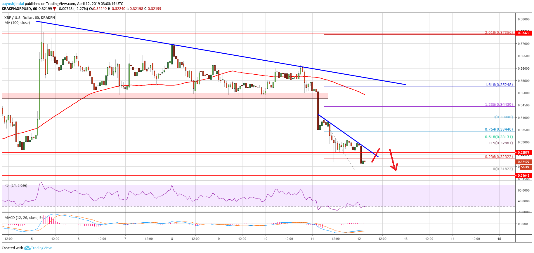 - There is a short term bearish trend line formed with resistance near $0.3260 on the hourly chart of the XRP/USD pair (data source from Kraken).