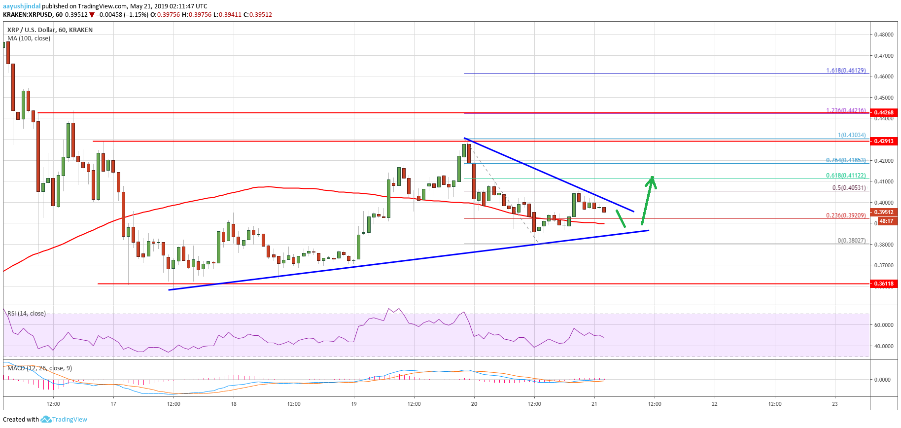 - There is a key bullish trend line forming with support near $0.3850 on the hourly chart of the XRP/USD pair (data source from Kraken).