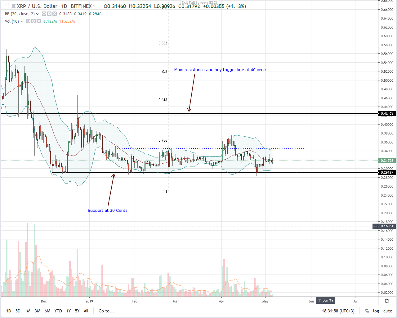 At spot rates, is stable adding 1.4 percent in the last week. Even so, technical candlestick arrangement points to an asset under sell pressure. Although it is until after XRP prices drop below Q1 2019 lows of 30 cents or Jan 30 lows, traders are cautious. It is easy to see why.