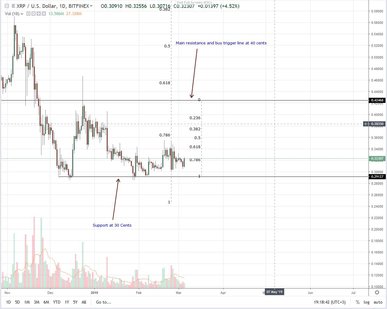 From our chart, and as mentioned in previous , 34 cents—the 61.8 percent Fibonacci retracement level of Dec 2018 high low is our next buy trigger line. It is after prices break and close above this 4 cents consolidation that XRP stands to rally with first modest targets at 40 cents.